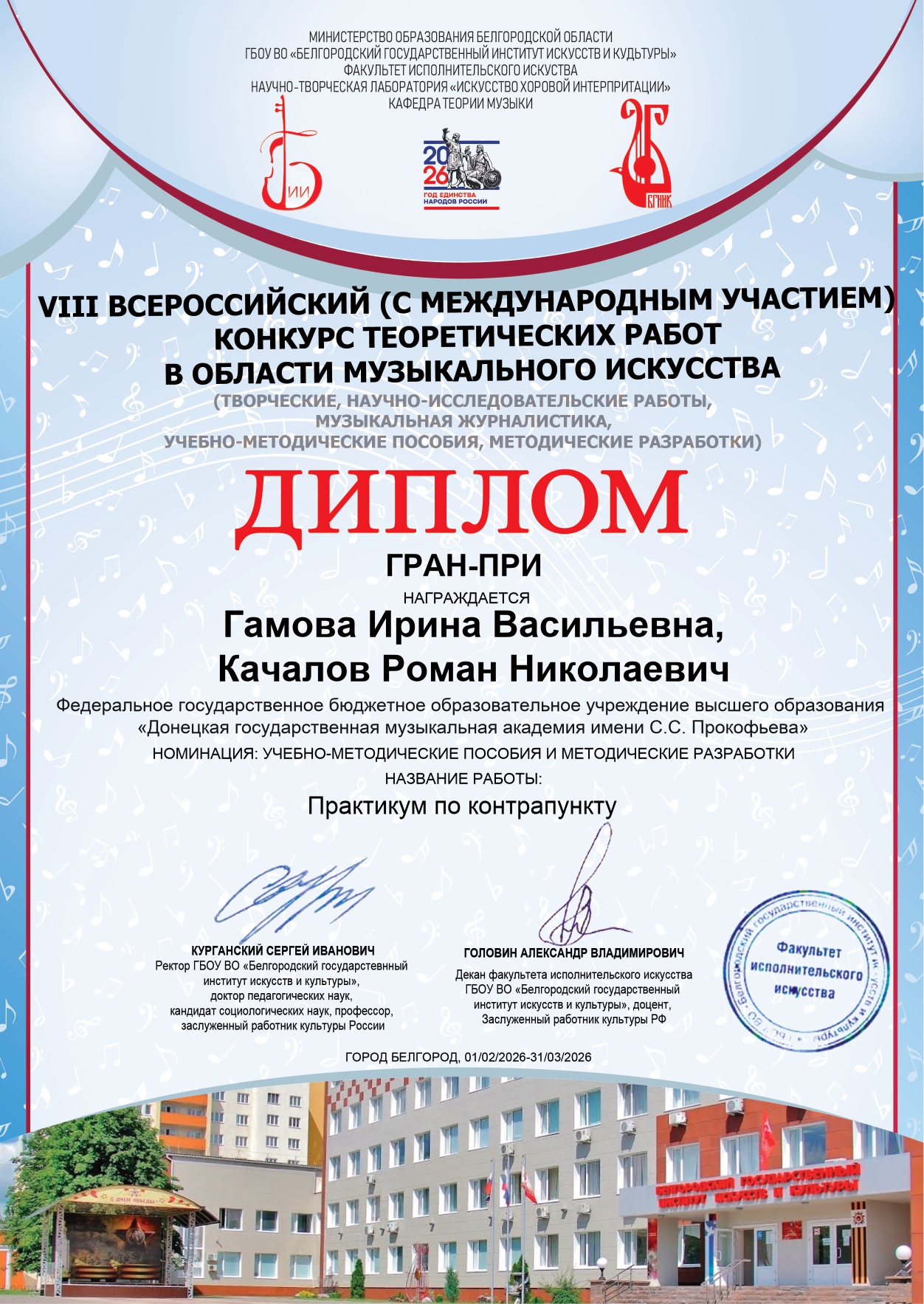 Гран-при конкурса в номинации «Учебно-методические пособия и методические разработки» за работу «Практикум по контрапункту» получили ректор ДГМА имени С.С. Прокофьева, профессор Роман Николаевич Качалов и профессор Ирина Васильевна Гамова.