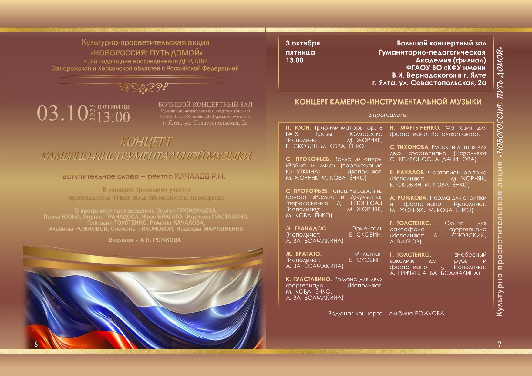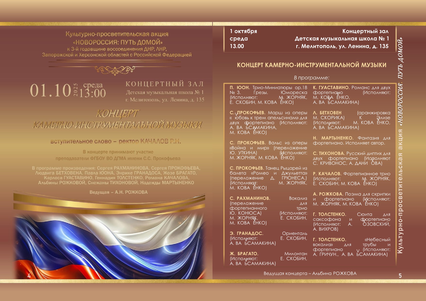 В программе: камерно-инструментальные концерты в исполнении ведущих музыкантов нашей Академии. Прозвучат как классические произведения (Сергея Прокофьева, Сергея Рахманинова, Людвига ван Бетховена, Карлоса Гуаставино), так и современные сочинения наших коллег (Геннадия Толстенко, Романа Качалова, Альбины Рожковой, Снежаны Тихоновой, Надежды Мартыненко). Также будут проведены мастер-классы и круглый стол с участием опытных педагогов.