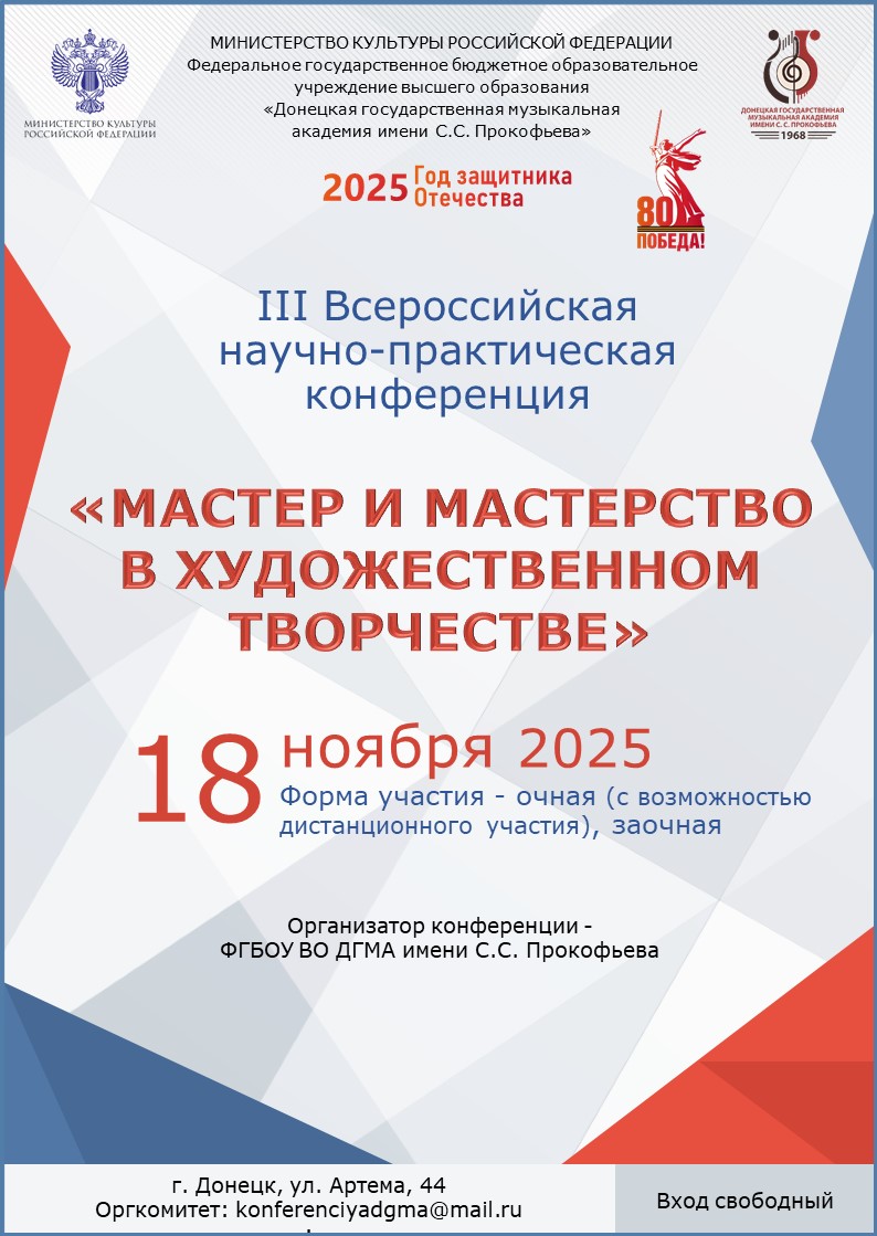 🏛 Донецкая государственная музыкальная академия имени С.С. Прокофьева приглашает вас принять участие в работе III Всероссийской научно-практической конференции «Мастер и мастерство в художественном творчестве», которая пройдёт в стенах нашего учебного заведения.