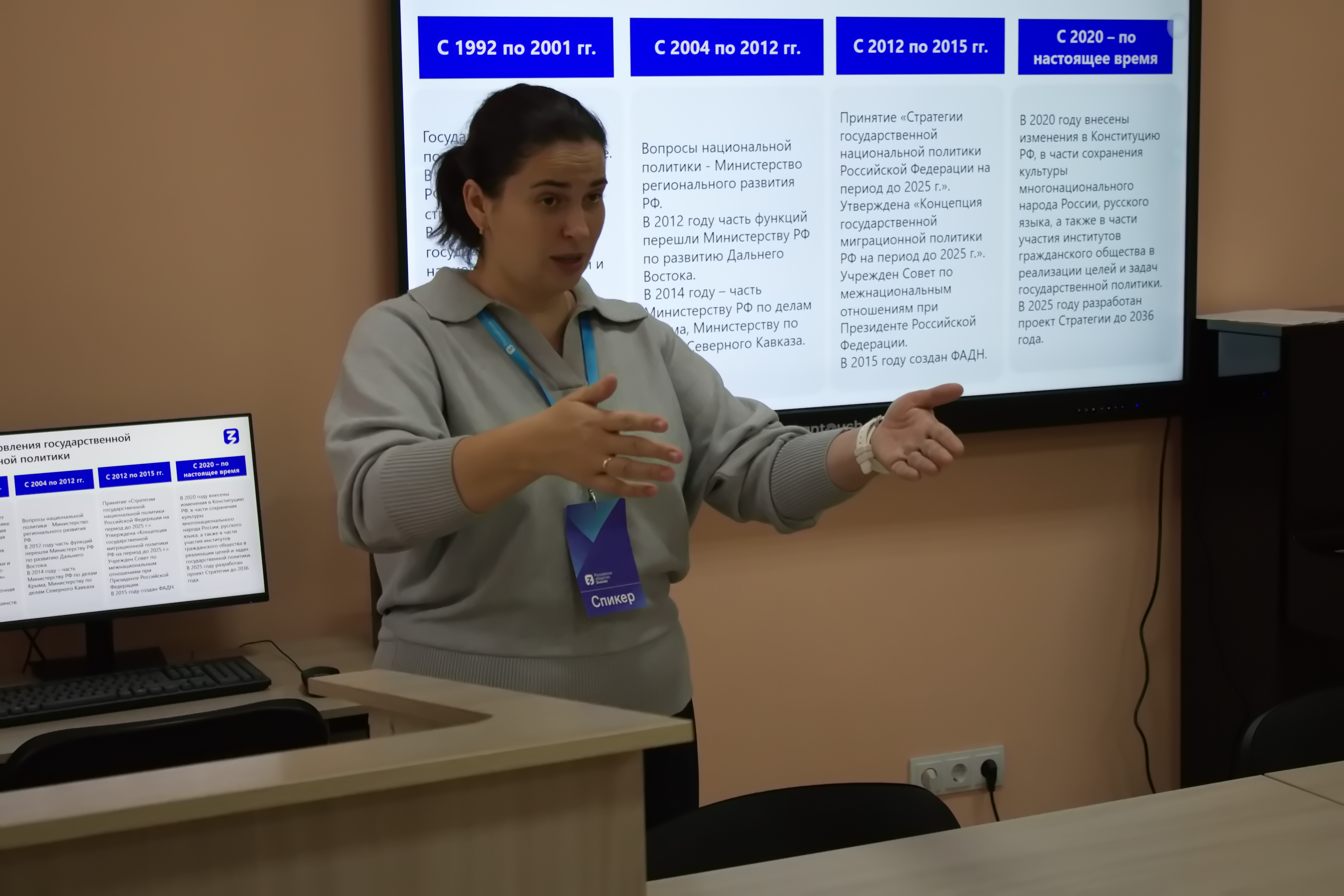 Также студенты узнали о новых вызовах: попытках недружественных сил расколоть общество, импорте чуждых идеологий и ценностей, необходимости адаптации мигрантов к российской культурной среде. Однако, по её словам, главное направление – «единство в многообразии». Эта формула лежит в основе новой Стратегии государственной национальной политики до 2036 года, над которой уже идёт работа.