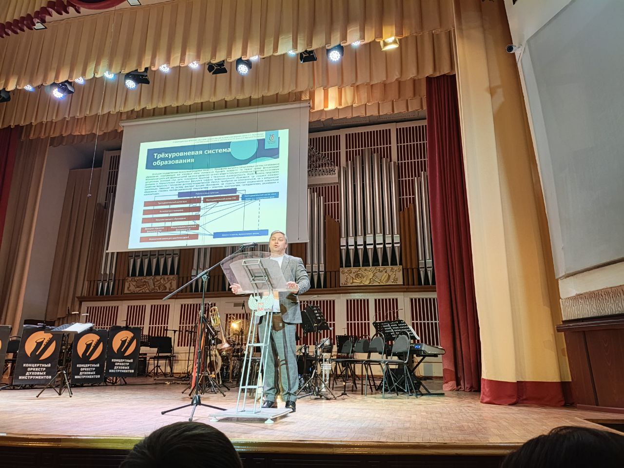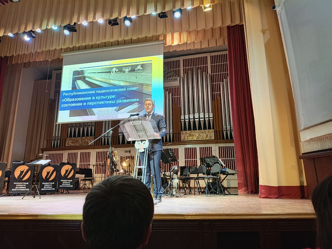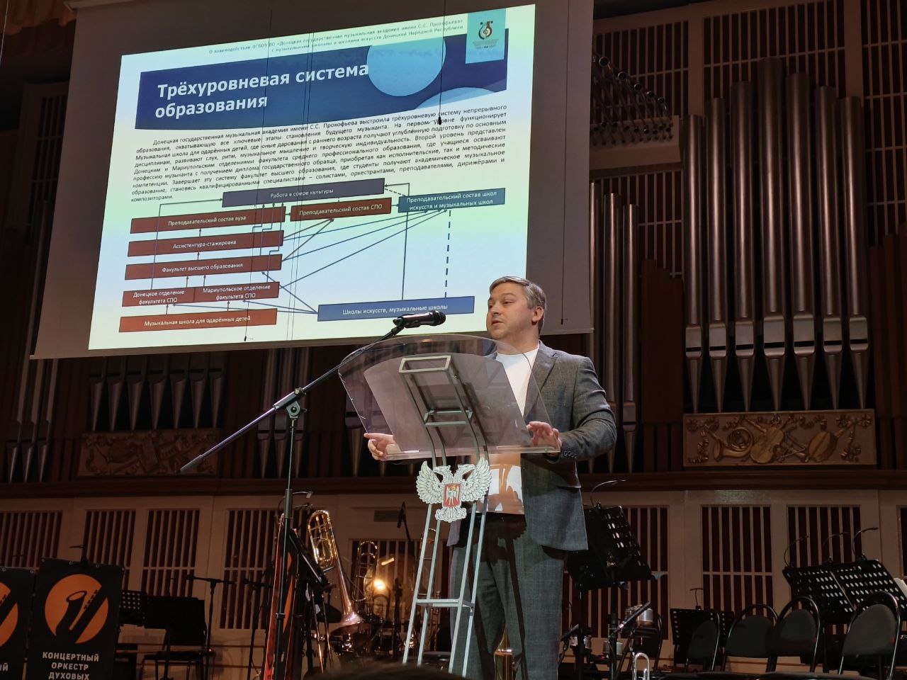 Ректор ДГМА имени С.С. Прокофьева Роман Качалов выступил с докладом о взаимодействии между Академией и учреждениями дополнительного образования Республики, из которого слушатели узнали о профориентационной и научно-методической работах вуза, динамике контингента обучающихся, Днях открытых дверей, концертно-просветительской деятельности.