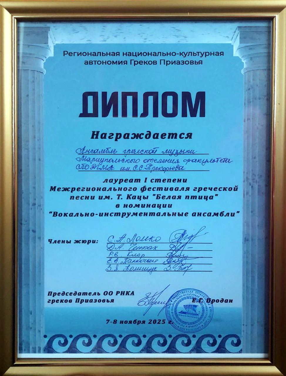 Наш коллектив под руководством Виктории Киор продемонстрировал высокий уровень исполнительского мастерства, артистизма и глубокое понимание греческой музыкальной традиции. По итогам конкурсных выступлений он был удостоен звания Лауреата I премии в номинации «Вокально-инструментальный ансамбль»!